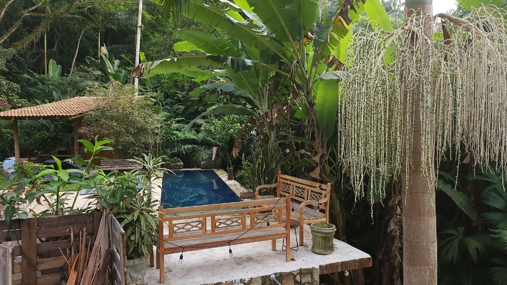 Área externa com piscina, sauna a vapor, churrasqueira equipada e cozinha completa. Café da manhã incluso.